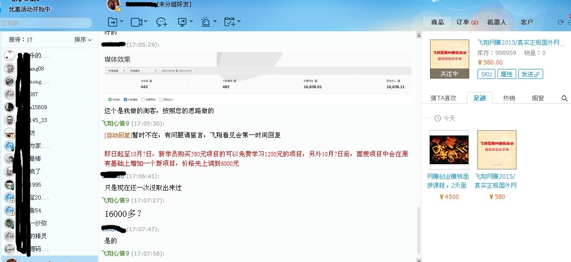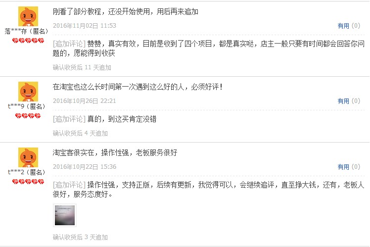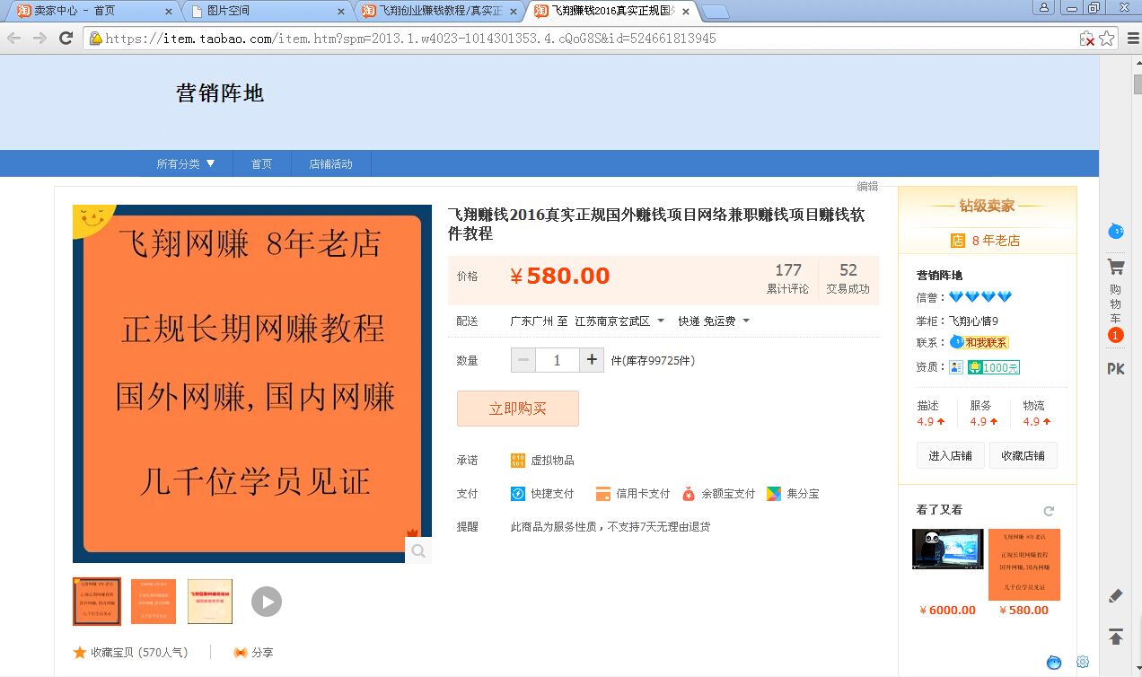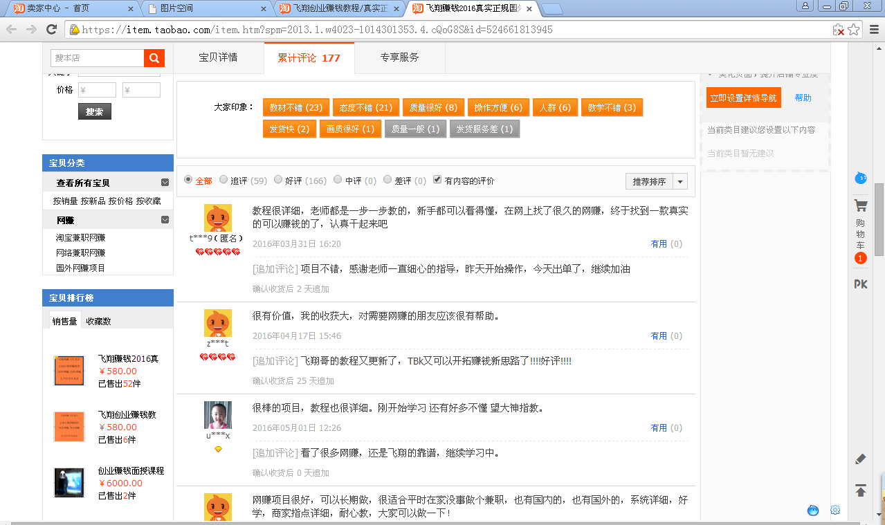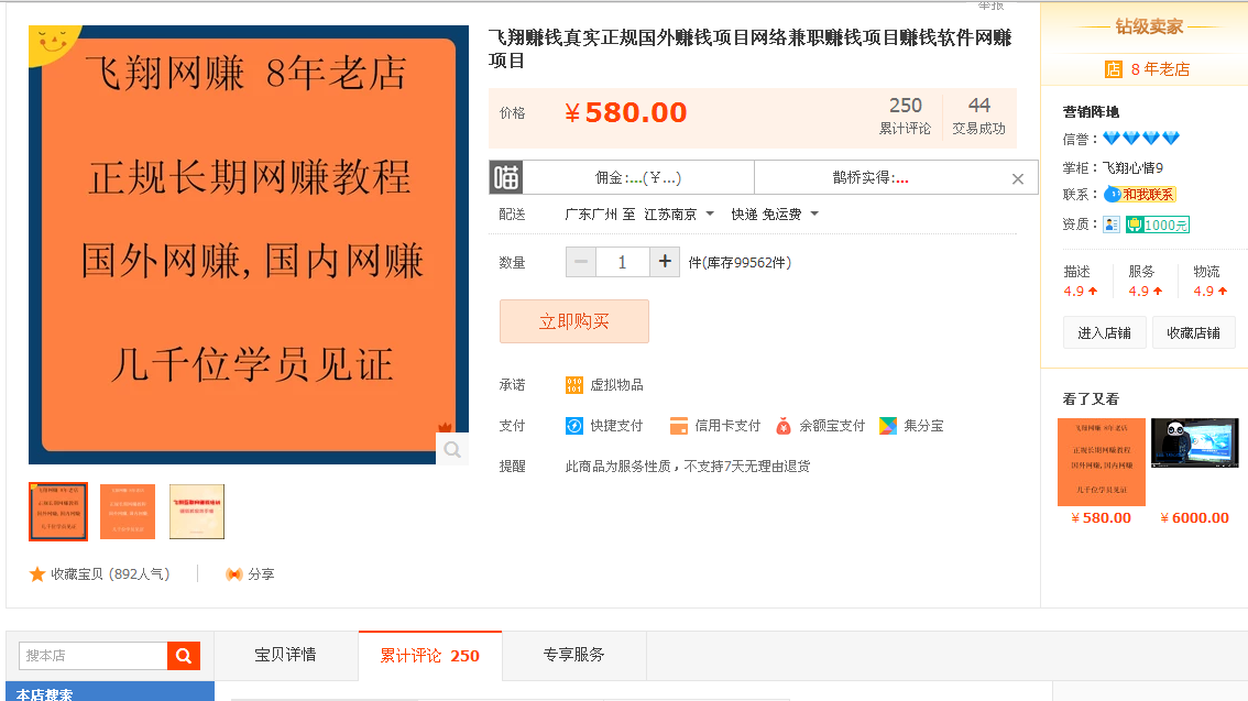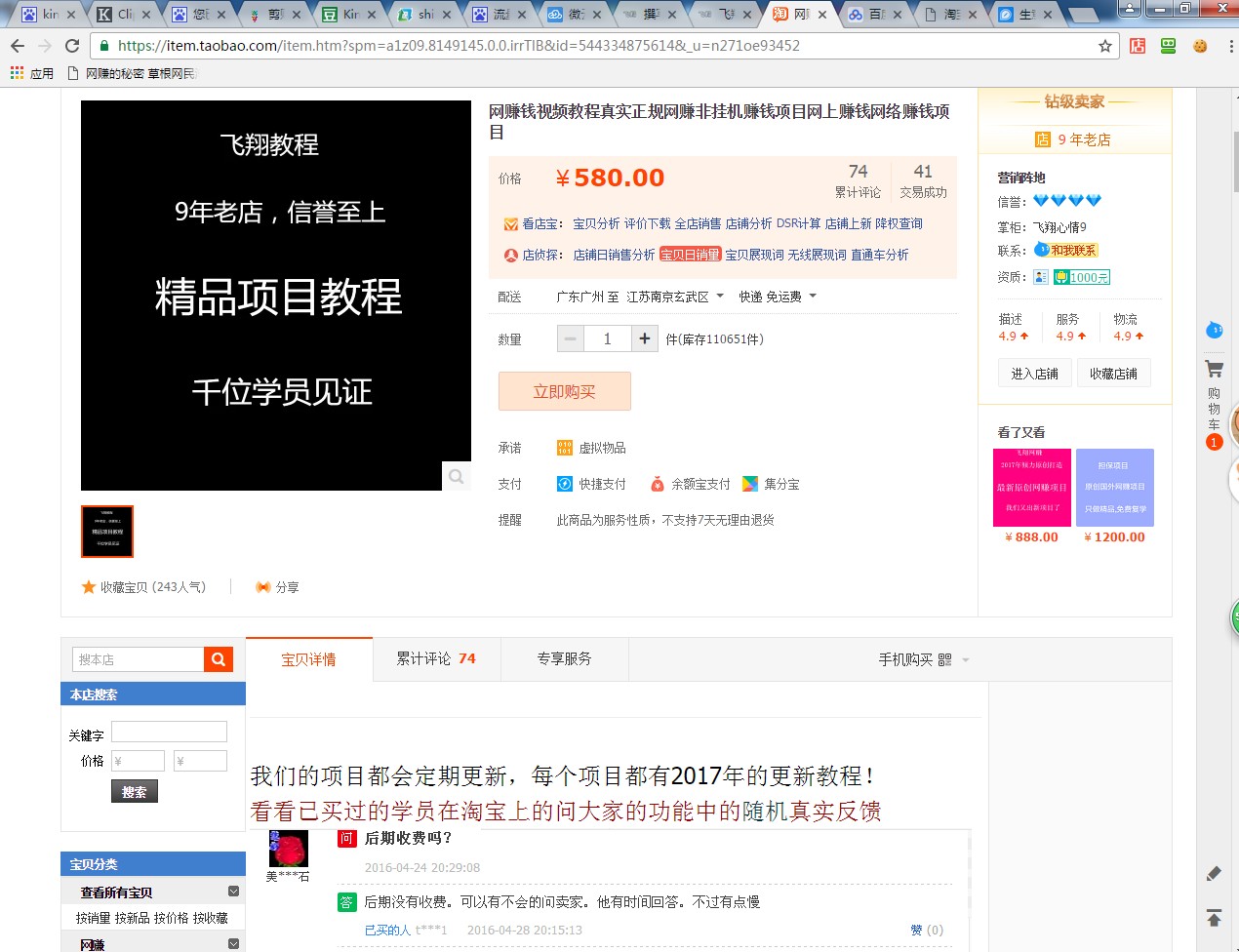 前言:相信很多朋友是通过淘宝这个平台认识飞翔的,也有些朋友通过一些网赚群里分享的一些飞翔原创网赚教程认识了飞翔。飞翔做网赚做了9个年头,淘宝上做网赚培训到2017年为止做了5个年头(目前淘宝做网赚类产品最久的一家,不管是店铺信誉,还是历史成交记录)项目售价在淘宝上属于比较贵的那种,因为我们做的都是一些原创项目的培训,有国内的网赚,也有国外的一些(淘宝上不少盗卖飞翔教程的人)这么多年的学员达到4位数以上,成功了很多,有稳定月入几千的,也有几万的更高的,当然,也有某些失败的,这期间有赞扬,有欢笑,也有咒骂,不满意的
