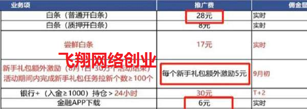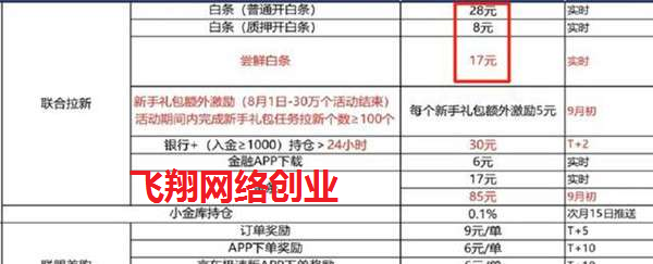 白条28+新手礼包5+京东金融6+金条17=56元一单。想专门做地推的,是可以尝试做一做的,即便不开金条17元,也有39元一单。