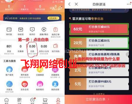 用户通过京东APP直接开通白条,可以获得一张60元的无门槛优惠券,一张20元的无门槛优惠券。