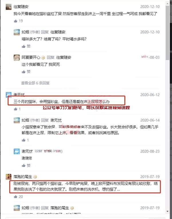 换个角度说,我们如果能针对于猫咪的各种习性,去做分析引导,从根源上解决猫尿床的问题,那么是不是又延伸出来了另一个赚钱的项目呢,比如说虚拟课程:训猫教程