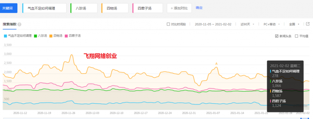 大家好,我是飞翔!关于健康类的,补气养气之类的产品,一直热度都挺高,随着经济的发展,大家对健康的重视程度越来越高,需求也越来越大,做这类健康养身的产品,只要掌握一定的流量,销量都不会差,下图中的几个方子,搜索量都非常可观。