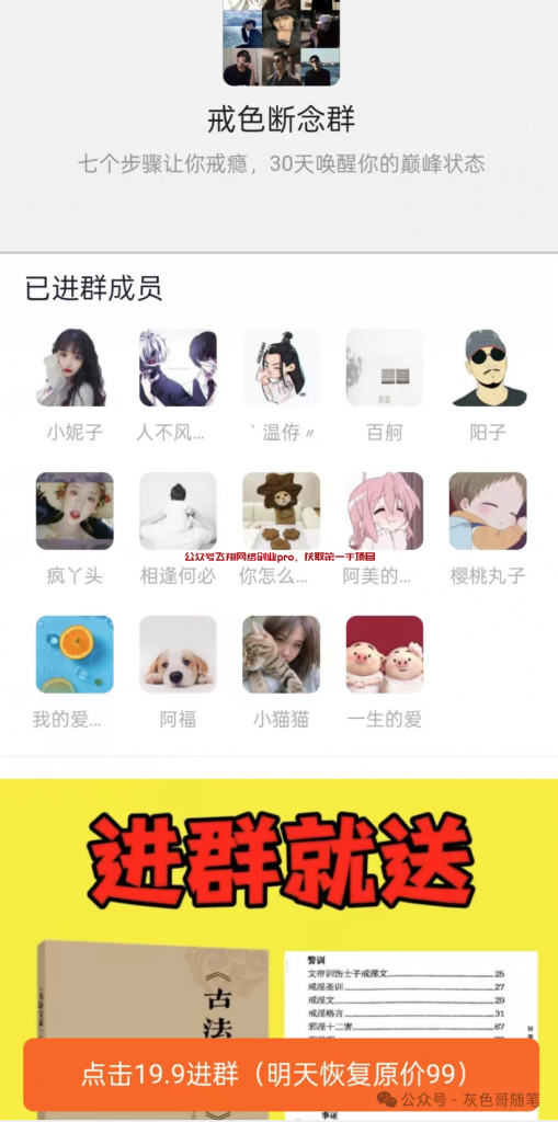 公众号再打广告:“想进互助群?想领戒色秘籍?””特价19.9!明天恢复原价!”价格优惠,文案诱人,小白很难不心动。
