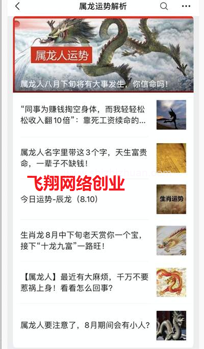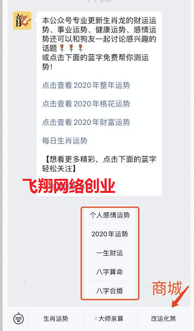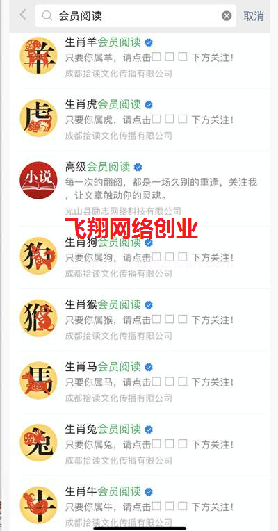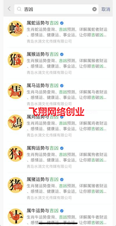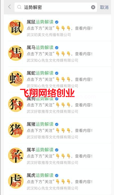 看懂了吗?每个属性都申请了一个公众号,后面加上运势解读,这样做的目的其实就是拦截对这方面有需求的用户,比如是属羊的,那么有人就会去搜索属羊的运势怎么样,这样你就有可能搜索到他的公众号,看了他的内容觉得还可以可能就会关注,关注就会在他那里销售,目前我看他们的业务还是很多的,同样操作的模式还是这个,其实原理都是一样的。