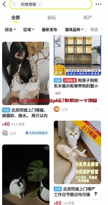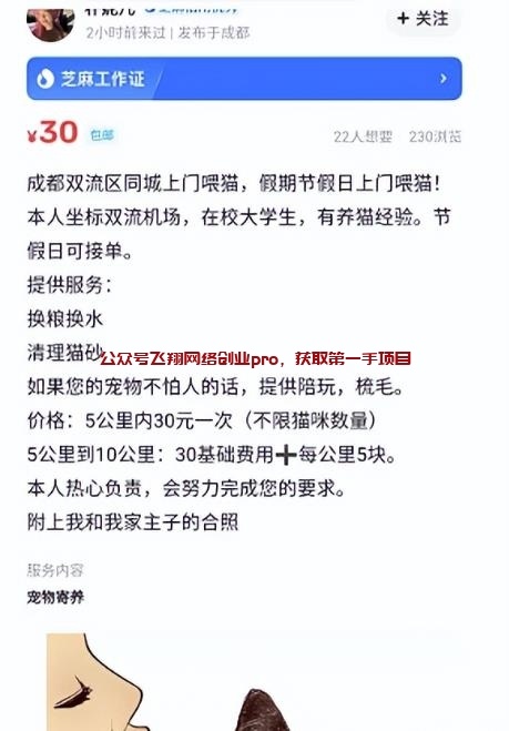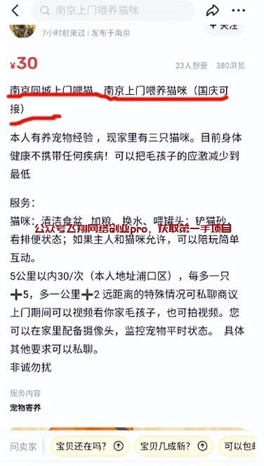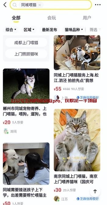 因为这个副业我们只能做同城,所以文案里一定要写明你所在的城市,例如南京同城上面喂猫、寄样、南京同城狗狗喂养等等,具体参照下图