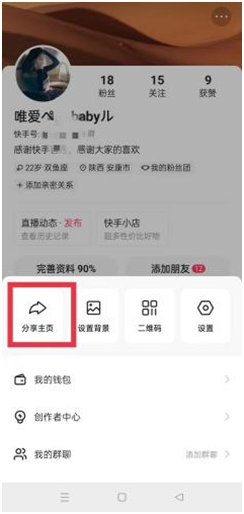 3.分享自己主页,生成海报保存本地,把保存的图片和快手号以及自己的后台收款码发给我,然后开通小铃铛,海报生成方式如下图所示