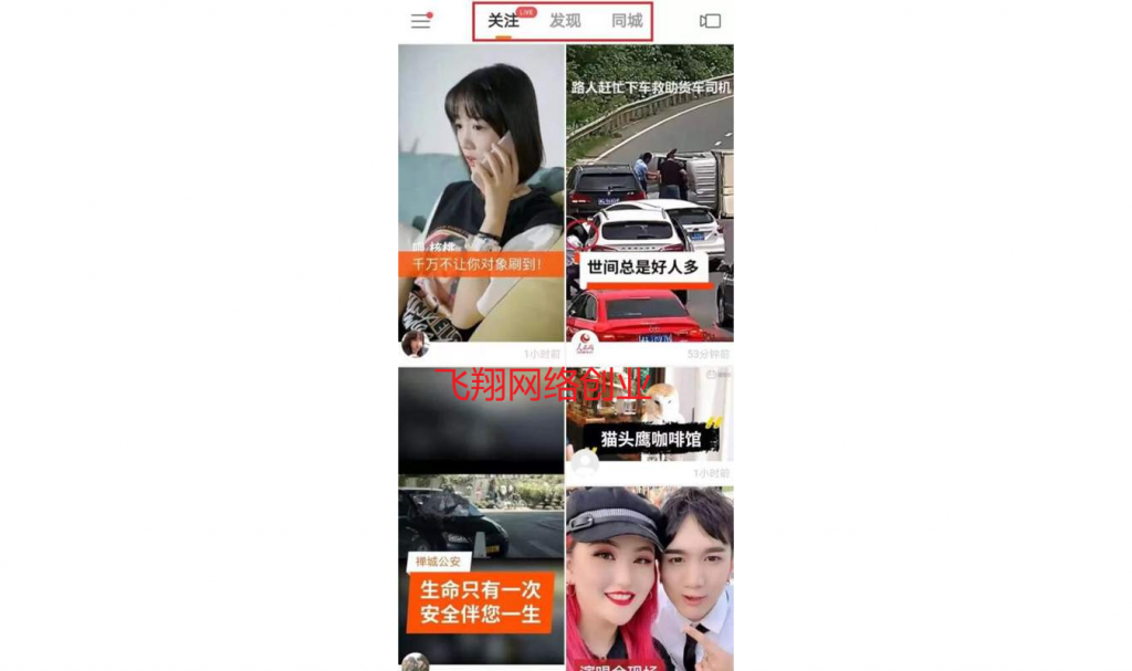 1. 快手内“关注”和“发现”为同级版块,发现页以双列Feed流形式呈现,用户对于内容有更多选择。
