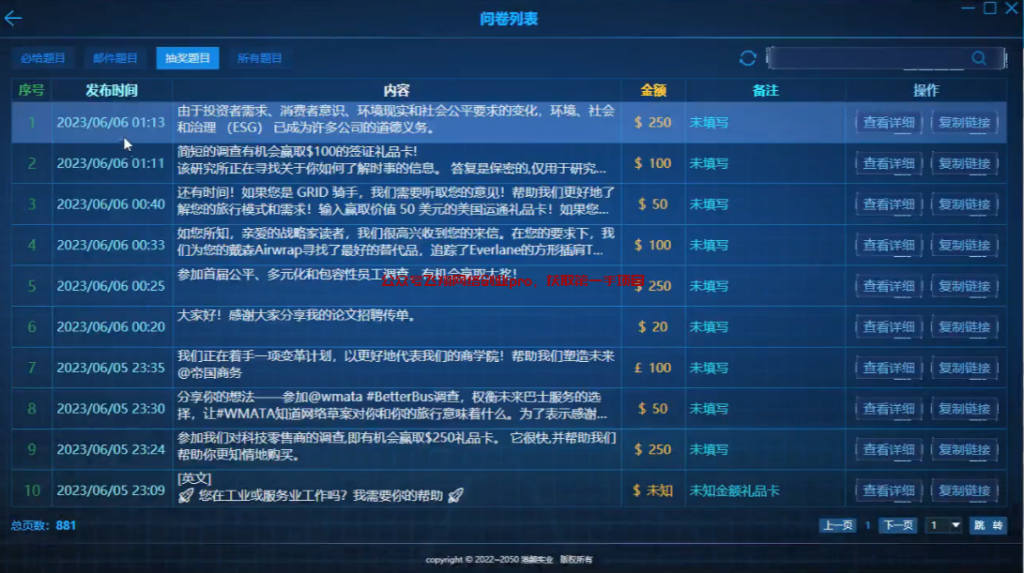 调查项目大家都不陌生,就是完成一些机构,公司或个人发出的有偿问卷调查,来获取收益。比如国外调查的,你完成调查问卷后,调查站会给你的邮件发送(亚马逊礼品卡)(香草卡)等等一些国外网购平台的优惠卷/礼品卡,这些礼品卡可以和卡商进行交易,目前的行情兑换比例大概是1:5.5-5.8这个区间,就是10美元的亚马逊卡可以换58元左右
