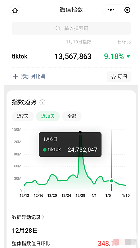 我们看下微信搜索指数,最高的时候搜索量破亿了,这就从侧面体现出关注tiktok的人很多的