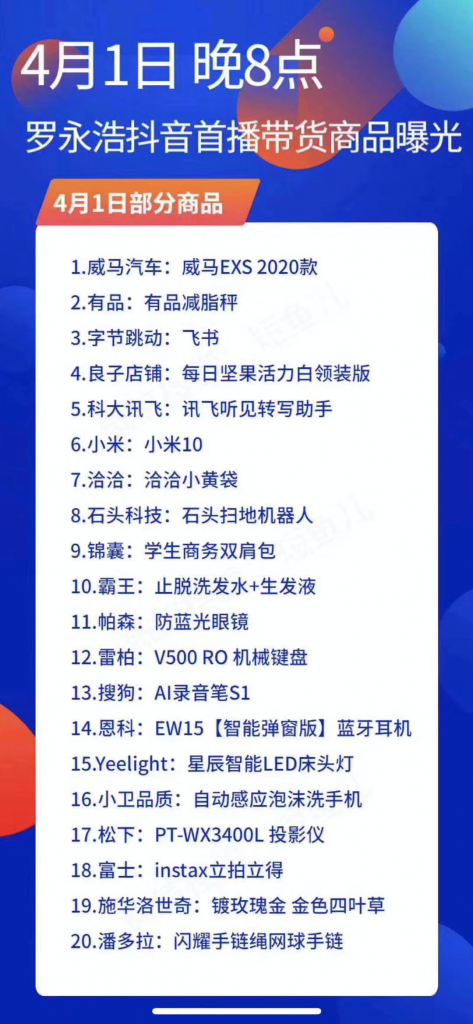 4月1日中午,一张据称罗永浩首播带货商品图曝光,合作的品牌方除了小米,还包括威马汽车、科大讯飞、搜狗、石头科技等共20家。