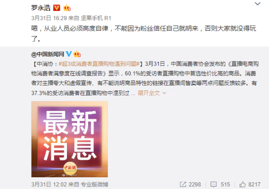 出师未捷身先死?随后,罗永浩连忙表态亮决心,“嗯,从业人员必须高度自律,不能因为粉丝信任自己就胡来,否则大家就没得玩了。”