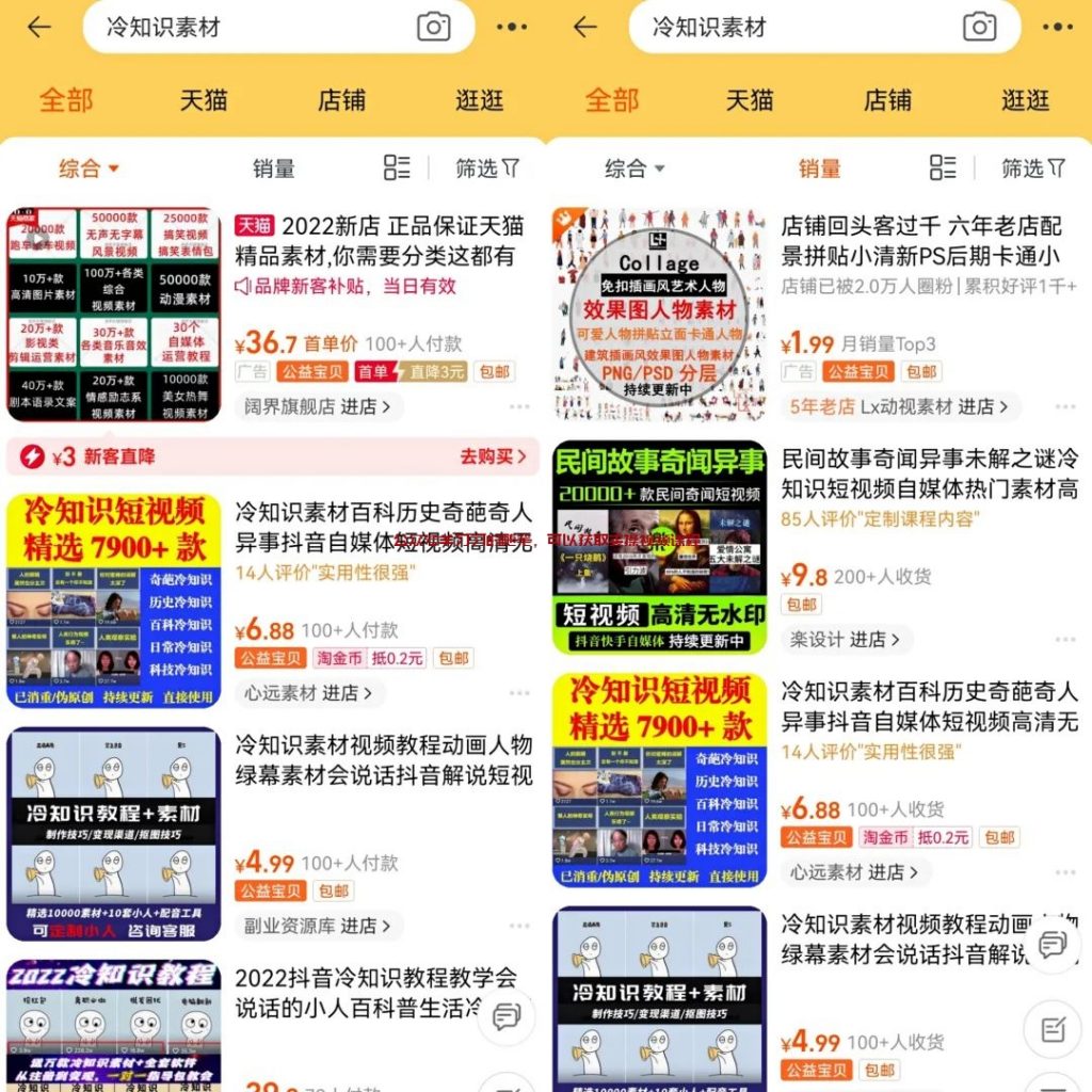 素材这块非常关键了,好的素材决定了我们的视频吸引力如何。素材这块推荐直接去淘宝或者拼多多搜索关键词“冷知识”,这类素材在上面还是很多的,选择一些就可以了