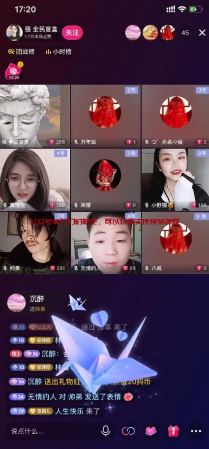 盲盒就位后,主播就可以开始热场了,问观众想看哪个数字的盲盒,观众如果想开盲盒的话,就需要打赏一个纸鹤,价值99抖币,相当于15元