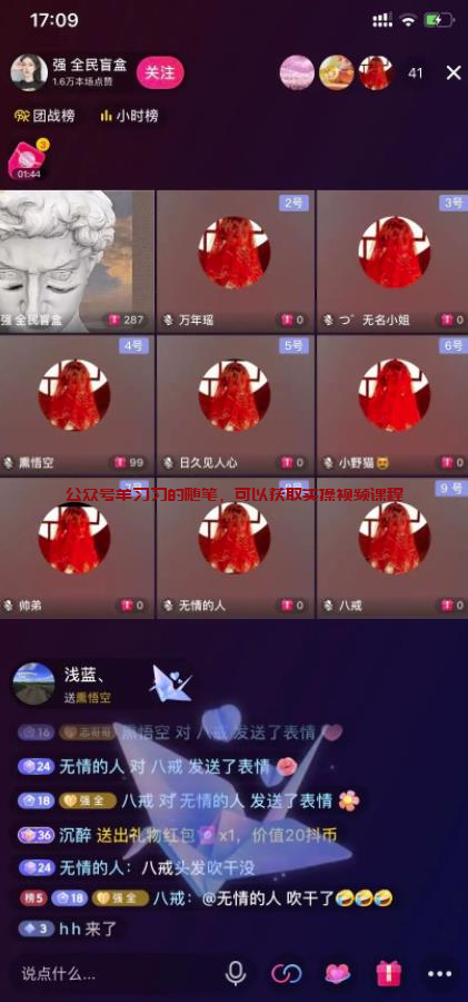 如果有人想要参与和主播连麦做个“盲盒”,首先要关注主播,然后用统一的头像排队进入直播间