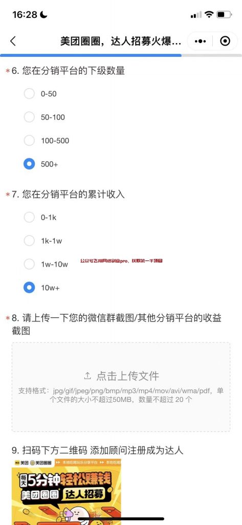 问卷里最重要的实际就是问你有没有做过分销,然后下级数量多少,这里当然填越多越好了,平台肯定希望招募的都是有资源,有能力的达人