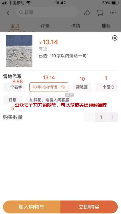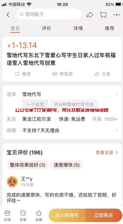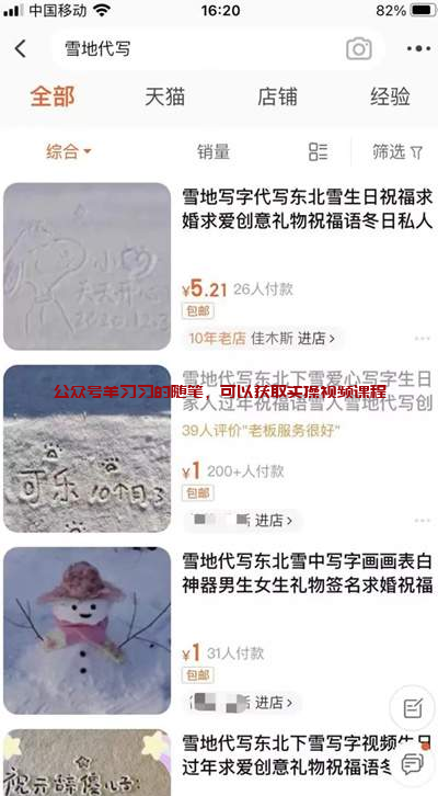北方这时候到处都是雪天,雪地写字没有任何成本,绝对的0成本的副业项目。单子一般直接来自于网店,我们可以去淘宝或者闲鱼发布此类服务