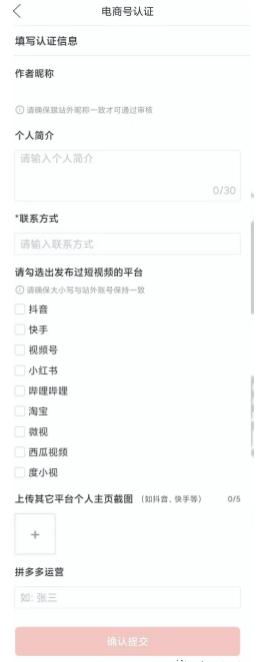 如果你其它平台也有运营,并且具备一定的粉丝量,那么可以直接进行认证,拼多多会根据粉丝量进行评估,并分配相应等级。等级越高,得到的流量扶持就越大。只需要上传主页截图,提交申请后将进行审核。一般审核时间为7个工作日。如果自己不方便的话,也可以找人代认证