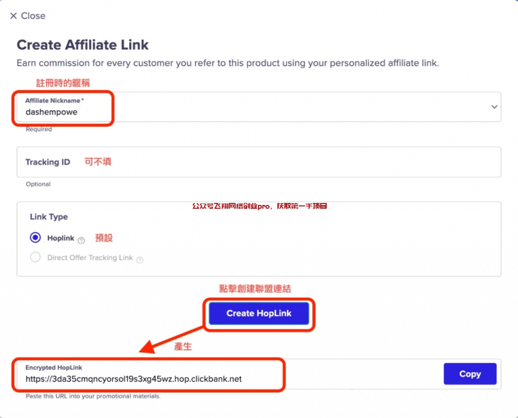 点击 Create HopLink 下方会生成联盟链接,先把联盟连结存起来,等下会用到