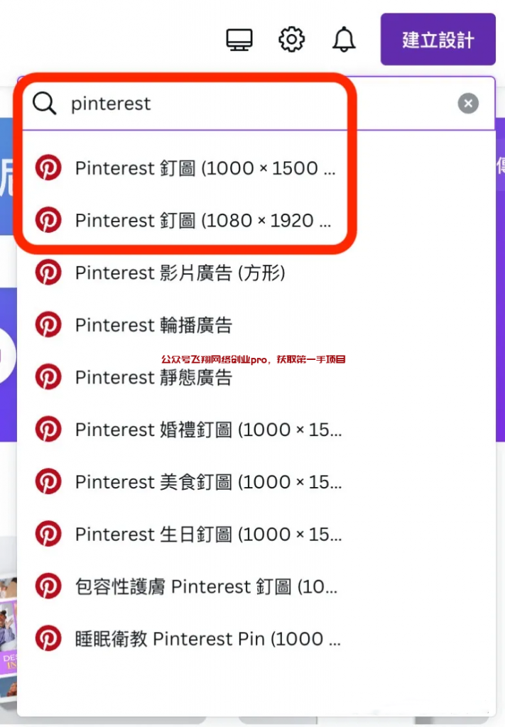 再来到 Canva 制作 Pin 图,到 Canva 首页点右上角「建立设计」按钮,输入「Pinterest」,选择你想要的图片大小