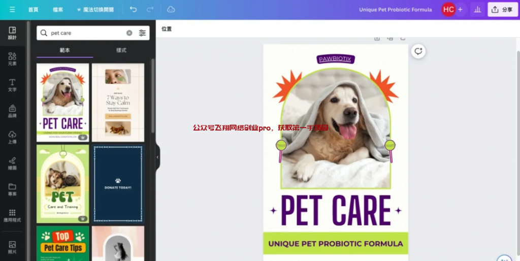 在左侧选「设计」,搜索栏输入你要推广的主题来找相关模板,例如我想找宠物照护,我就用 pet care,找到喜欢的模板后再依据你的需求修改文字及图片,这样就快速完成了 Pin 图的制作