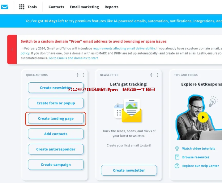 以下范例使用 GetResponse,注册好帐号后,点击左边 Create landing page 创建销售页