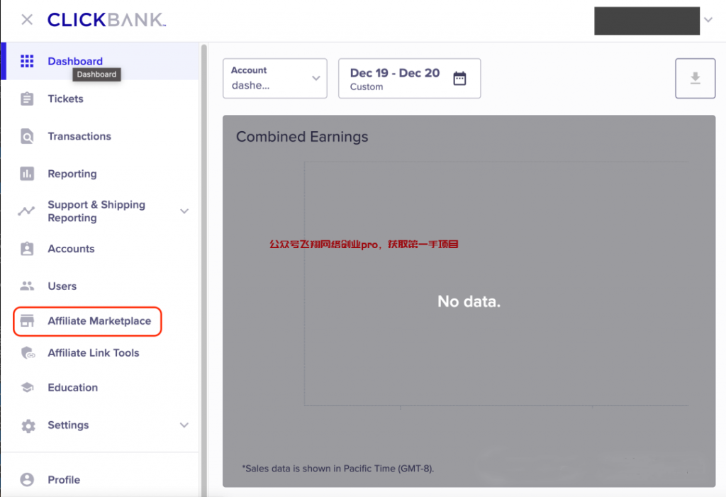 注册好帐号并且登入以后,会出现在 Dashboard 页面,点击右侧 Affiliate Marketplace 进入联盟营销产品页面