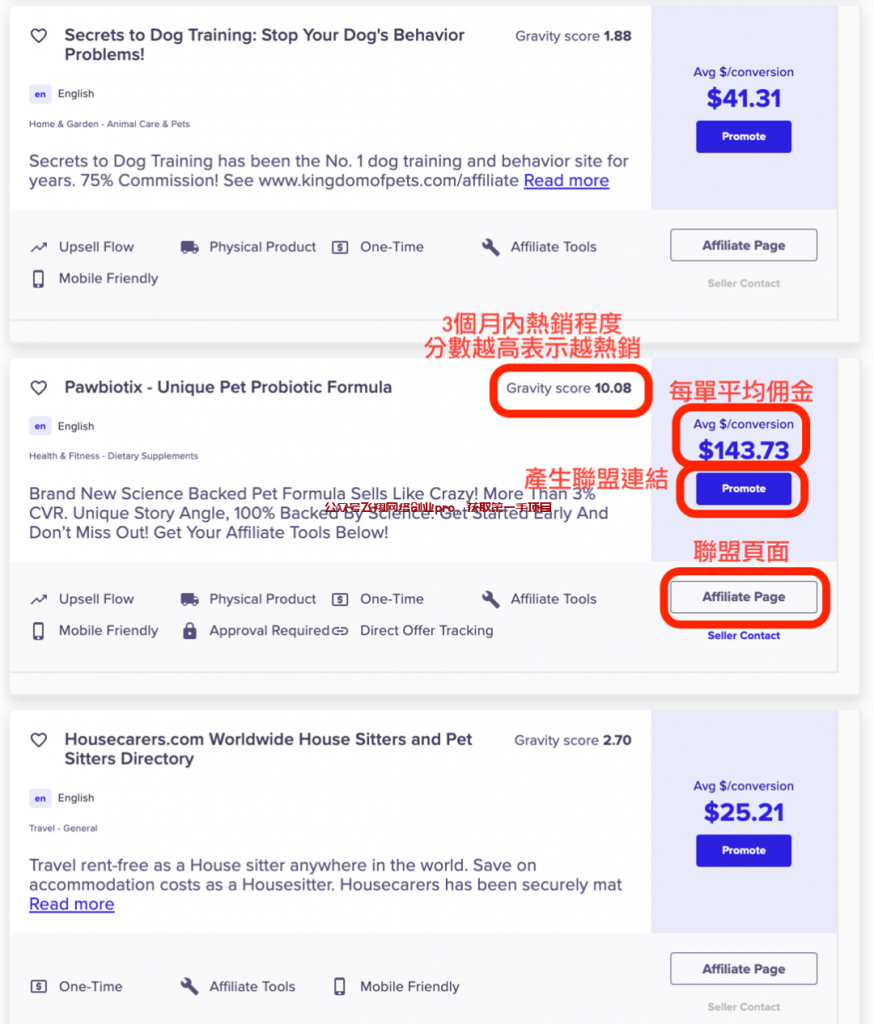 找到了一些关于宠物的产品,每一项产品都有「Affiliate page」和「Promote」的按钮,「Affiliate page」内会有该产品厂商提供用来协助你营销的工具,例如:电邮模板、博客文章、图片、影片等众多有用的资源