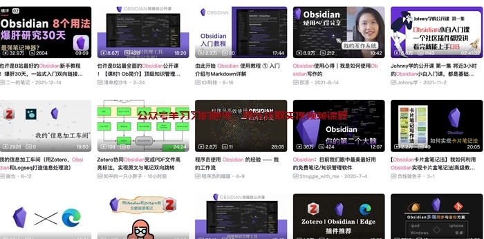 我们再搜索obsidian这个软件的视频,里面有介绍这款软件怎么用的,也有介绍如何用这款软件做知识管理的。每个视频的播放量也都可以,最少的播放量都有2K左右,这款软件可能很多人没听说过,是一款知识管理类的工具