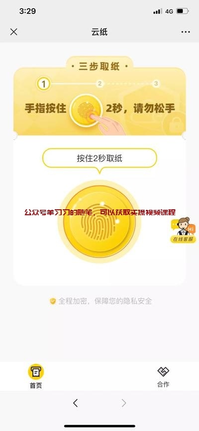 再继续往下操作,出现了一个公众号,根据APP的消息提示,我们需要关注公众号后,机器就会自动免费出纸了