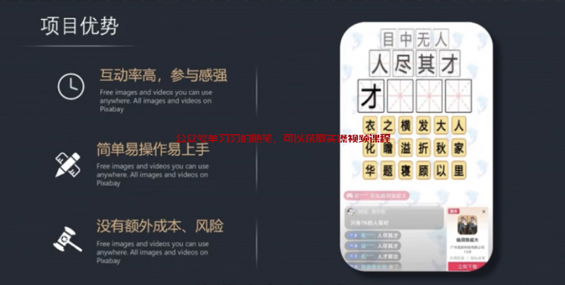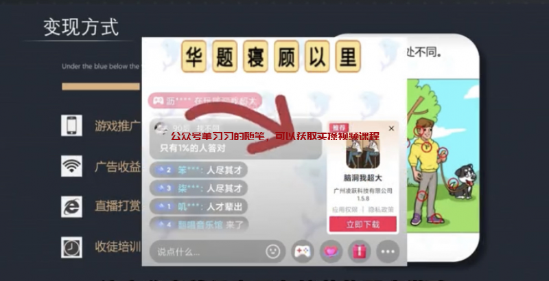 大家好,我是飞翔(V:2944984903),今天咱们分享一个挺有趣的直播赚钱玩法,不靠打赏就能有500+的收益,而且直播间的互动也很强,这套玩法就是烧脑游戏直播,烧脑游戏包括我们小时候玩过的大家来找茬,看图猜明星,看图猜成语,你画我猜等等之类的