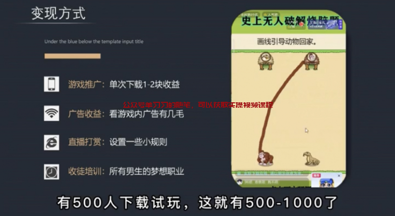 烧脑游戏直播变现的主要方法就是右下角挂着的那个游戏链接,别人点击了下载,一般都有50%-60的佣金,一次下载,咱们一般会有1-2块的收入,500个人下载就有500-1000的收入了