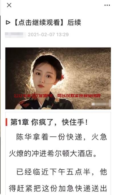 一条文案比较吸引人的视频,点击开后会引导你点击链接,然后跳转到公众号里,再引导阅读原文,就会跳转到小说站点上了,看到一定的章节后,就需要充值了,这是所有小说分销项目的通用玩法