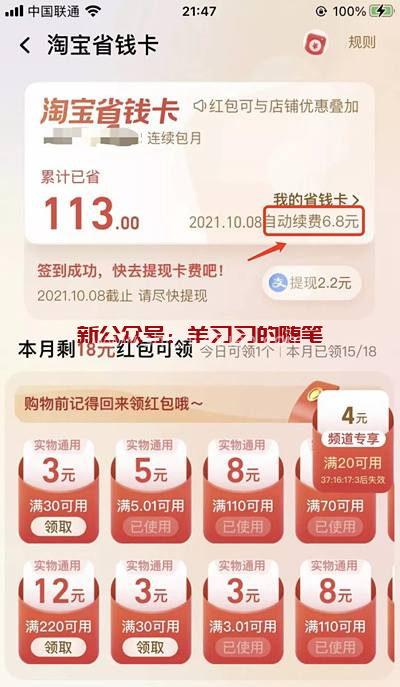 这个省钱卡,新用户有机会几毛钱买上一月或者一季度,老用户要是连续包月的话,也仅仅需要6.8元/月,而购买的会员,每月有91元的淘宝抵扣红包+22元的饿了么外卖红包,只要不是从不购物的人群,会员费是很容易赚回来的。