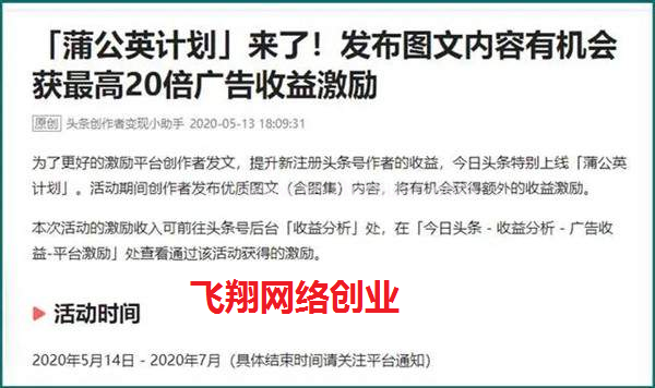 大家好,我是飞翔!今天听朋友讲头条开展了蒲公英计划,很多创作者的收益都翻倍了。正好看到一篇文章,转过来给大家看一下