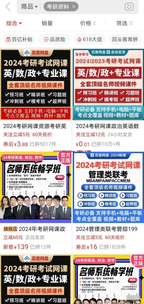 学习类课程不光可以赚网盘拉新的收益,还可以卖课程,某宝某多多卖学习类课程的非常多,而学习类的受众都是非常明确有学习需求的,在这个方面的付费意识也会强很多。
