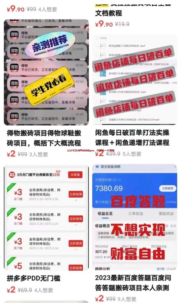 你可以在闲鱼搜索“副业项目”这类的关键词,你就能看到平台内有一堆售卖项目教程或者软件工具这种虚拟资源的店铺,而且价格普遍很便宜
