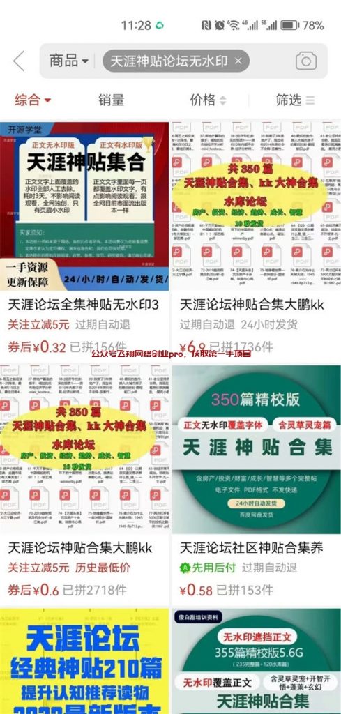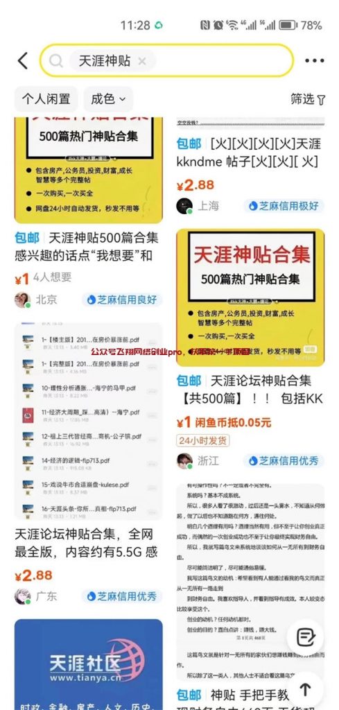 现在这些天涯神贴合集,涵盖了当年论坛里最火的历史、商业、玄学、故事等帖子,现在在闲鱼,拼多多,淘宝上,都有人在卖这些神贴合集