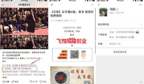玩法的核心操作点就在于以热门音乐为主题去做视频混剪,利用流行/热门音乐为诱饵给账号带来流量,再将流量导流到私域流量池卖车载音乐U盘的变现。