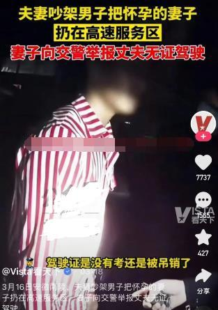 比如:快手上有个视频讲的是夫妻吵架,男子把怀孕的妻子扔在了服务区,妻子向交警举报丈夫无证驾驶。