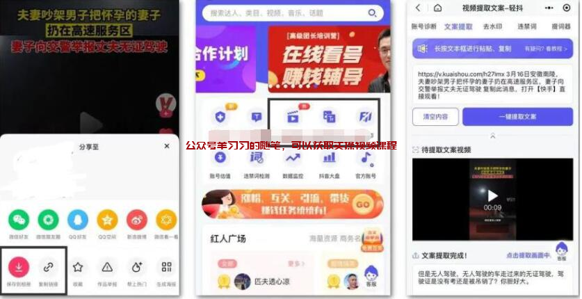 点击分享视频,选择复制链接,把链接粘贴到轻抖小程序,进行文案提取。