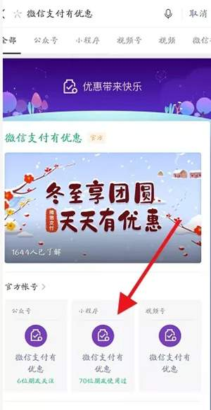 我们直接在微信上搜索:微信支付有优惠这个小程序