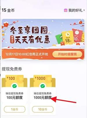 好礼界面里,可以兑换提现免费券,可以兑换其它类型的优惠券