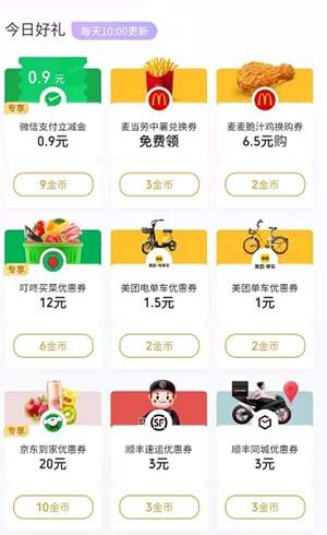 以麦当劳中薯券为例,一张券能卖5.22块,我们就按5块钱计算,15个金币可以兑换5张中薯券,等于可以直接卖25元,钱虽然很少,但是这是完全免费的羊毛,并且不占用我们的时间,平时假设上班坐地铁公交或者滴滴之类的,我们直接用微信支付,超市购买小件,比如矿泉水的时候,用微信支付一下,一周10笔支付,非常容易达到