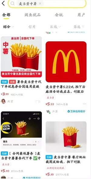 比如上图里有麦当劳的优惠券,3金币的中薯优惠券和2金币的麦麦脆汁鸡换购券,这些优惠券我们可以自己使用,也可以直接在闲鱼上出售