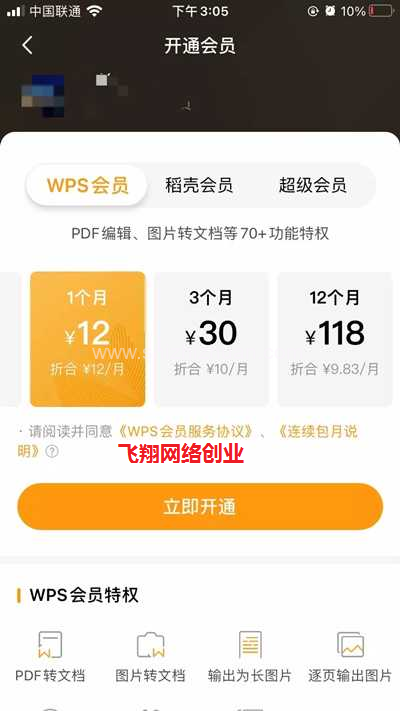 今天飞翔和大家分享1个信息差赚钱的案例,WPS是金山旗下的办公软件,可以说是家喻户晓,软件分为免费版和会员版,我们处理一般的文档,用免费的就足够了,但是如果需要用到一些专业功能的时候,免费版就不够了,这个时候就需要用到会员版,会员版也就是收费的,官方上面开通一个WPS会员需要12元一个月,而开通一个稻壳会员更需要18元一个月,果需要两个一起开通就要用30元一个月。