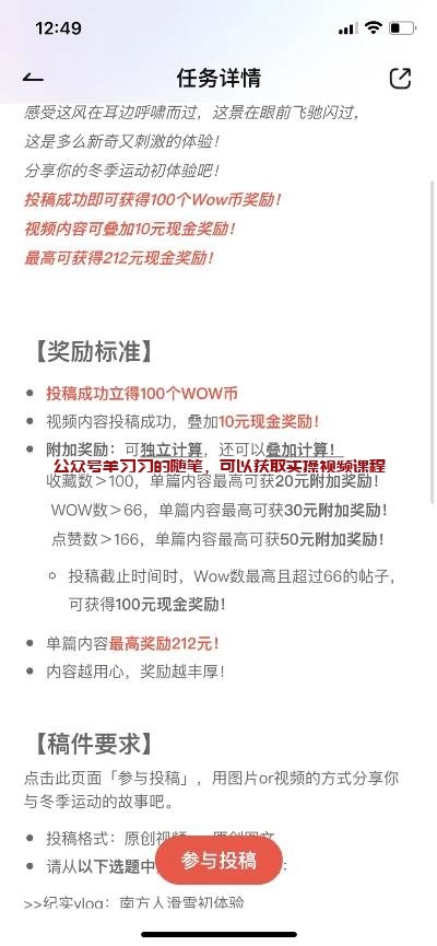 这个任务最高可以获得200元现金奖励,不过我们只要投稿成功就可以获得1000个wow币,相当于20元的现金奖励,然后再根据点赞数,收藏数,以及wow数继续叠加计算奖励,直至达到200元为止