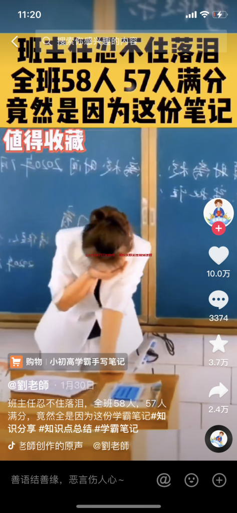 如播放一段学生课堂视频,然后配上文案:全班所有同学均上了重点本科,全靠老师总结的这本学霸笔记
