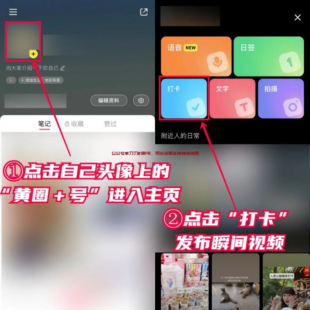 具体操作:打开小红书账号主页,点击自己头像上的“黄圈+号”进入主页,点击“打卡”,选择自定义打卡主题,发布你要展示的单个文字的图片,点击发布瞬间,即可生成单字圆圈,按需制作若干个即可组成引导话术,例如“咨询点这里”等,最多可展示5个字。