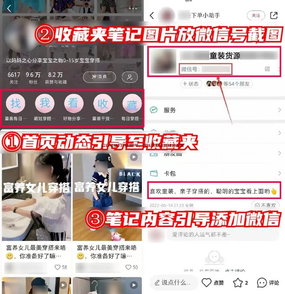 在账户主页的打卡区展示“找我看收藏”字样,引导用户点击收藏栏,只收藏1篇用小号发布的笔记,笔记图片放微信号截图,笔记内容写引导客户自行添加的话术。