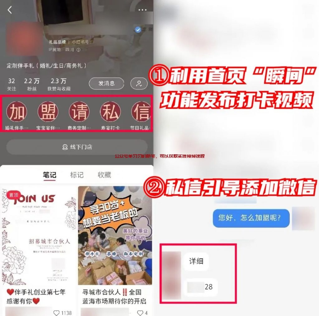 利用小红书首页的“瞬间”功能发布打卡视频,5个视频连成“加盟请私信”字样,私信回复微信号。