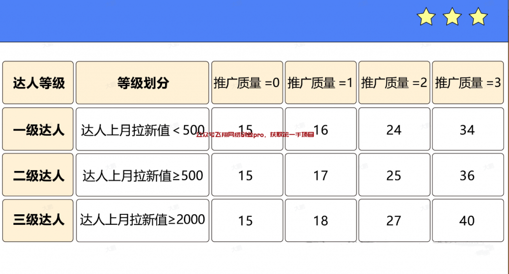 前面讲了,拉新的收益是15-40这个区间,平台会根据你上个月的拉新人数定级,最低为一级达人,最高为三级达人